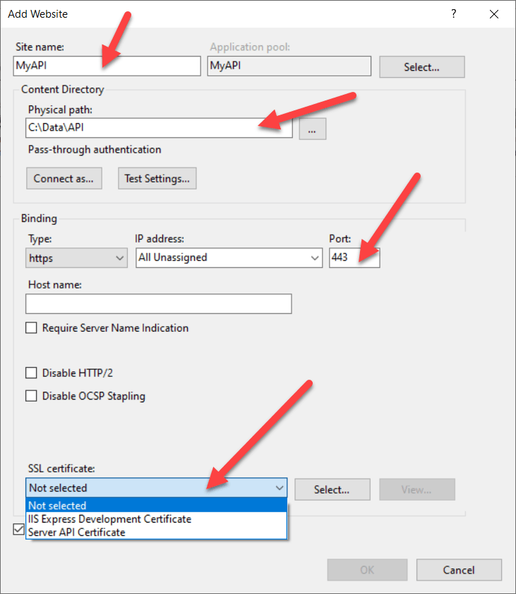 Give the site a name that you will be able to remember, and browse to the $TargetPath created earlier to set the Physical Path.