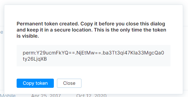 Note that once you close this window, the actual token is no longer available. Make sure you save this value somewhere.