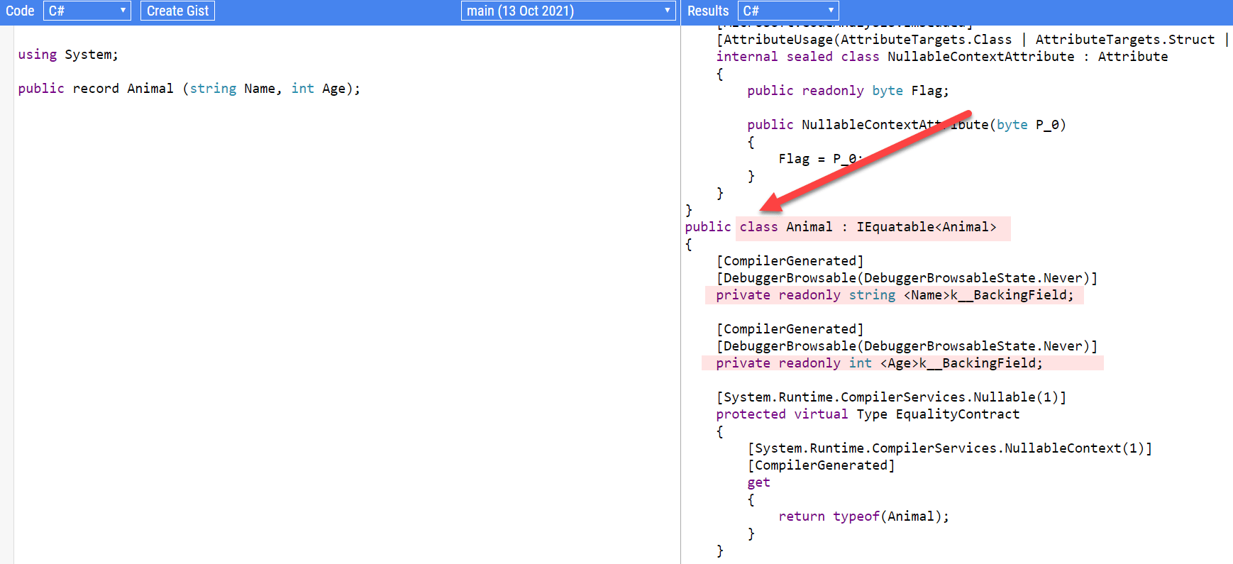 Among the considerable code the compiler generates to support the implementation of records, of note is the fact that ultimately a record is a class.