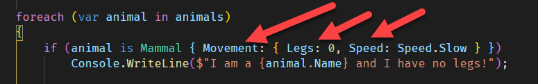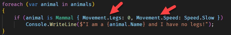 if (animal is Mammal { Movement.Legs: 0, Movement.Speed: Speed.Slow })