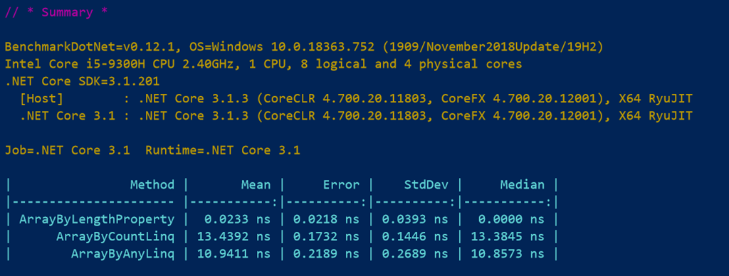 - SimpleJob here specifies that we want to benchmark the code using the .NET Core 3.1 runtime