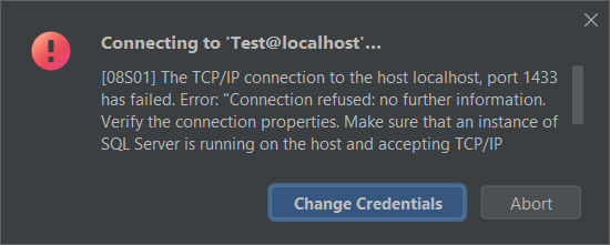 [08S01] The TCP/IP connection to the host localhost, port 1433