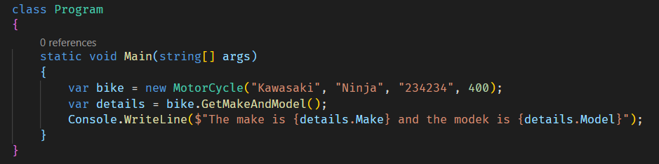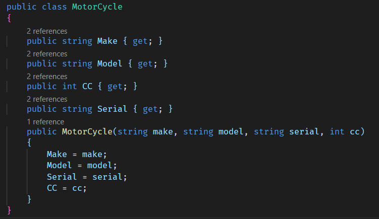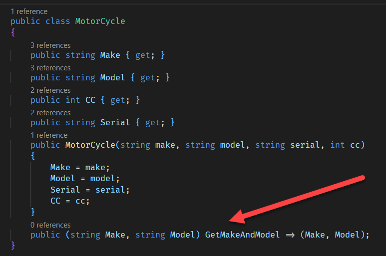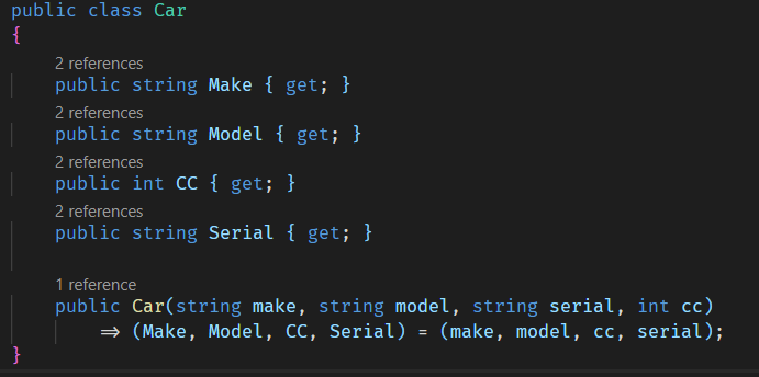 In our constructor we have made use of tuples by creating one with the four public properties in the class and simply copying the values once from the right (the parameters) to the left (the readonly properties).