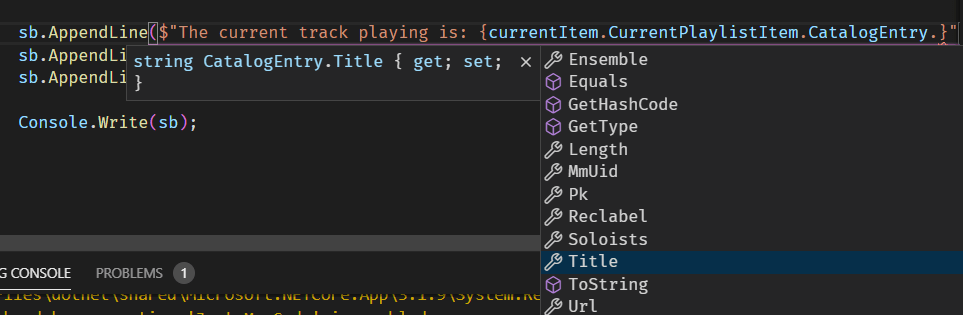 sb.AppendLine($"The current track playing is: {currentItem?.CurrentPlaylistItem?.CatalogEntry?.Title}");