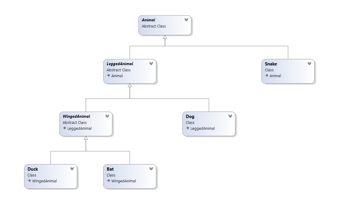 C# does not allow inheritance from multiple classes, but for this particular problem we do not need this. A winged animal (at least this far) also has legs.