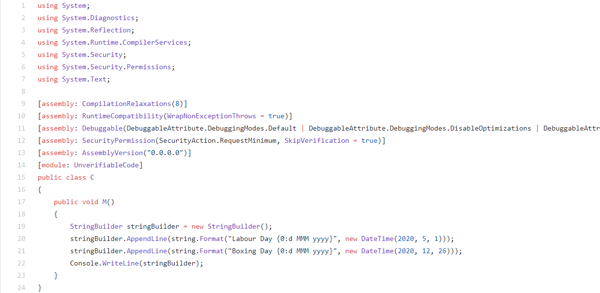 newHolidays.AppendLine($"Boxing Day { new DateTime(2020, 12, 26):d MMM yyyy}");
