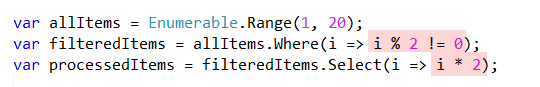 var returnItems = Enumerable.Range(1, 20).Where(i => i % 2 != 0).Select(i => i * 2);