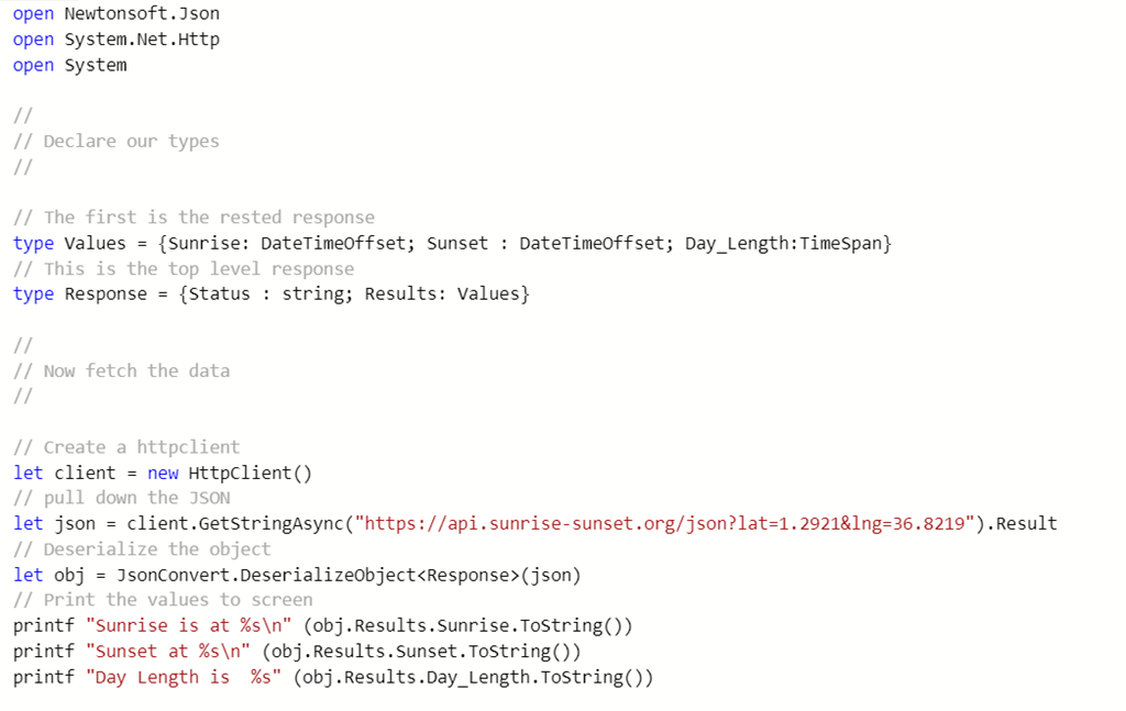 For example I have some code here that downloads the sunrise and sunset times in Nairobi and prints them to console