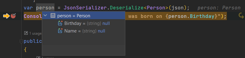Console.WriteLine($"{person.Name} was born on {person.Birthday}");