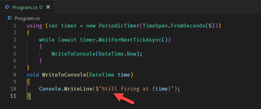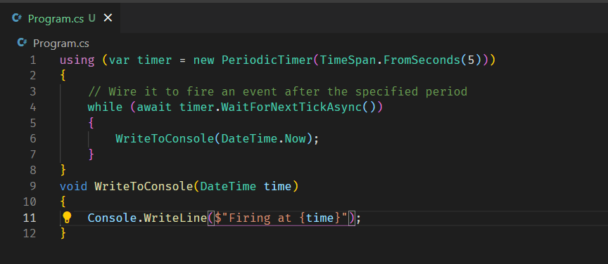 using (var timer = new PeriodicTimer(TimeSpan.FromSeconds(5)))