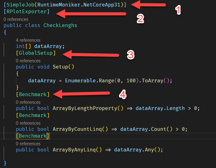- SimpleJob here specifies that we want to benchmark the code using the .NET Core 3.1 runtime