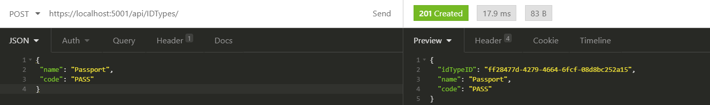You can see on the right pane that the IDType is created successfully and we receive a 201 with a redirect to the new object.