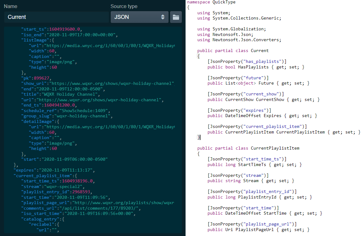 Here you paste the JSON on the left pane and it generates the corresponding C# on the right. You can then rename the root class. Here I called it Current, but you can use any name.