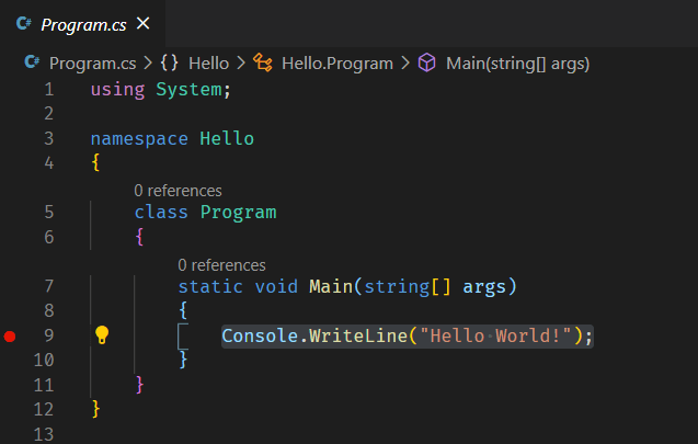 To prove that the debugger works, we set a breakpoint in our code by clicking in the margin.