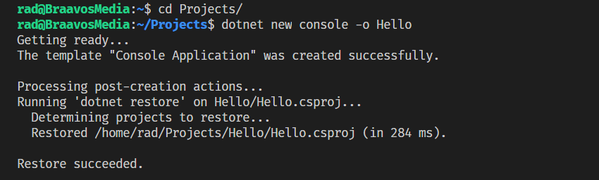 This creates a console project and places it in the folder Hello.