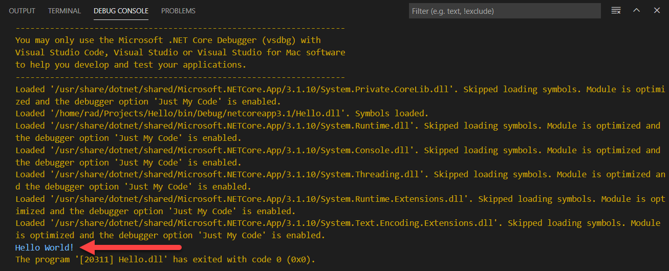 In the debug window we should see status messages from the debugger and finally our output.