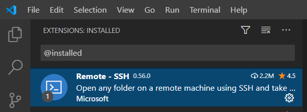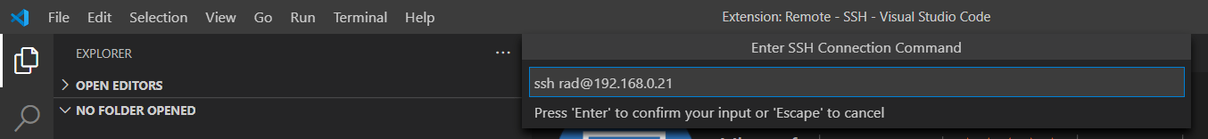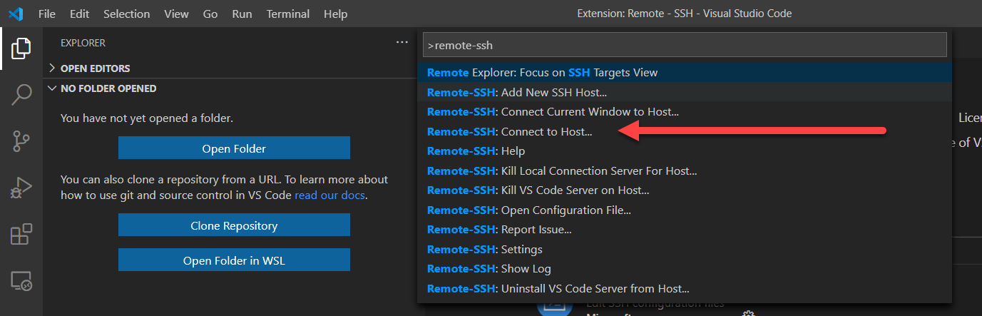First, hit Ctrl + P to open the command bar. Type remote-ssh into the command.