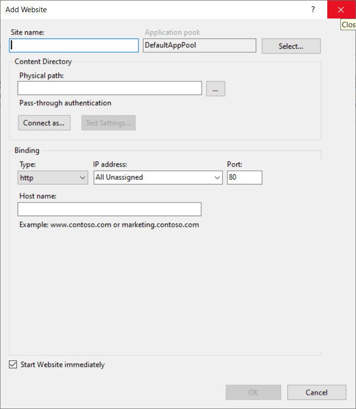 Give the site a name that you will be able to remember, and browse to the $TargetPath created earlier to set the Physical Path.