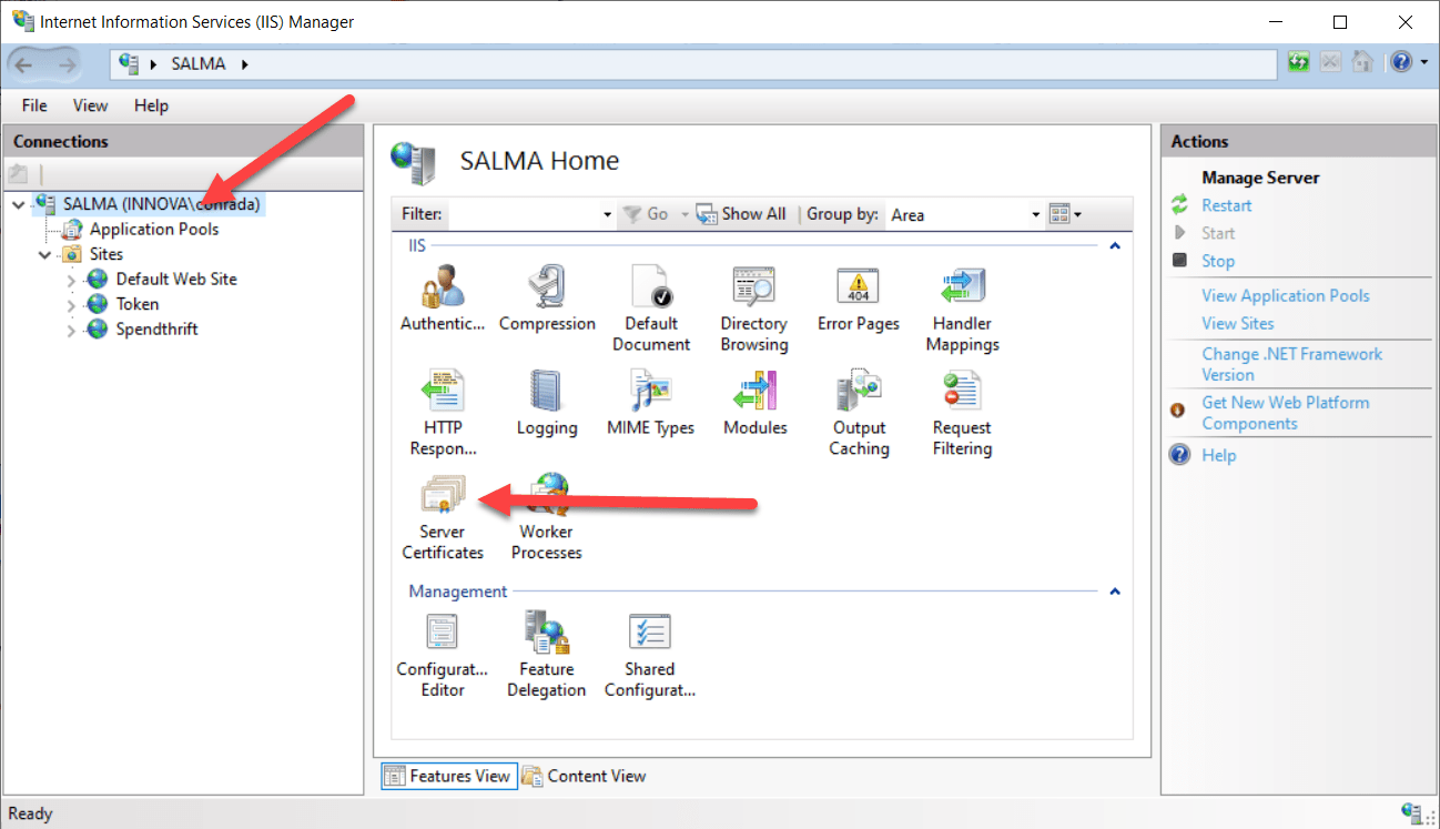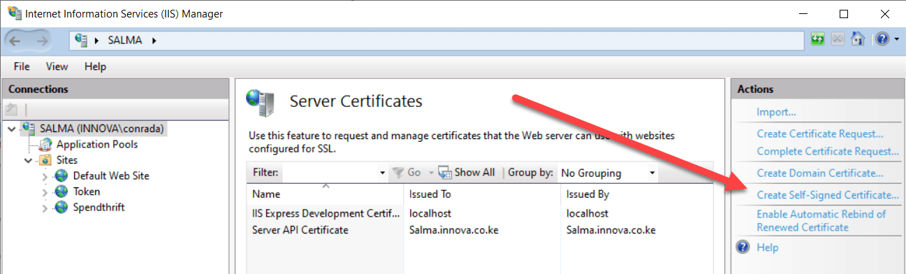 If there is no SSL certificate in the list, cancel then go to the root of the console and select Server Certificates